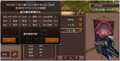 船只养成分为:船只打造、船只改造、船只升级、船只维护四部分。当人物等级提升后,玩家可以通过生活技能收集材料为自己打造不同类型的船只。船只升级主要通过海上任务、海上副本解谜获得航海经验使船只等级提升。等级提升后船只基本属性会有全面的提升船只打造、船只改