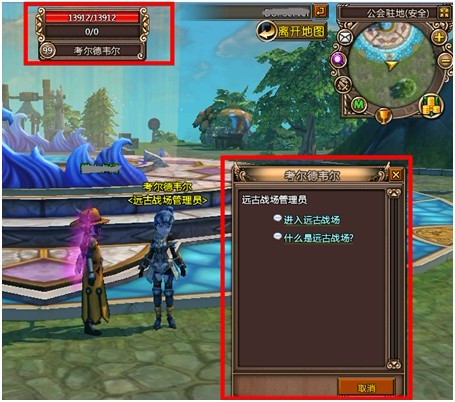 远古战场的进入: 当前,玩家可以通过工会基地内的“远古战场引导员”弹出对话框进入当前远古战场。战场区可以支持100~150玩家。!击败[BOSS名称]可以获得大量荣耀值和工会经验奖励。