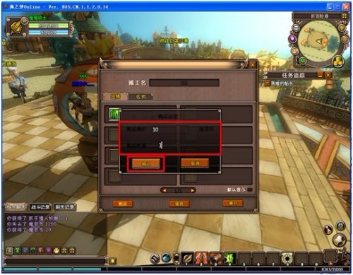 5,输入物品的售价和需要出售的数量,完成操作后,点击确定后物品就上架了,这个时候点击“开始摆摊”按钮就可以摆摊啦。一个摊位最多可以上架8种物品,玩家处于摆摊状态时不能移动,不能使用技能和物品。如果物品已经绑定或上锁是不可以摆摊出售的哦。