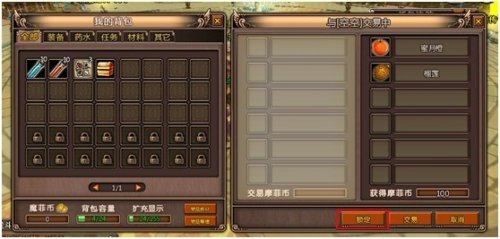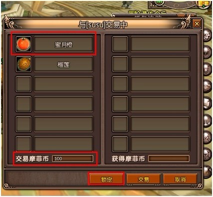 3、双方放置物品 可放置非绑定的物品或金钱,物品可右击直接放入或通过鼠标拖动的方式放入交易框内,金钱需输入相应的数字。物品及金钱在未点击“锁定”前均可撤销或更改,双方交易过程中,任何一方皆可点击“取消”结束交易。