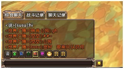 第一次聊天:游戏屏幕的左下方,是供大家沟通和交流的聊天窗口。显示玩家游戏的聊天内容。您可以选择不同的频道来发布聊天信息。游戏中按照信息输出目标的不同,将聊天分为多个频道,包括本地、队伍、公会、世界和密语。本地:在一定范围内,输入的聊天内容只有当前附近
