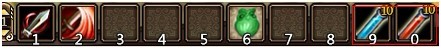 使用物品 同施放技能一样,点击快捷键“B”,用鼠标左键点击您想使用的物品的图标,并将其放在画面右下角的快捷栏中,再点击相应的数字键即可使用物品。另外,您也可以通过鼠标右击直接使用物品。